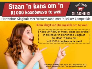 Staan die kans om ‘n R1000 koopbewys te wen! Hartenbos Slaghuis vier Vrouemaand met ‘n lekker kompetisie! Koop vir R500 of meer, plaas jou strokie in die houer in Hartenbos Slaghuis en staan ‘n kans om ‘n R1000 koopbewys te wen!