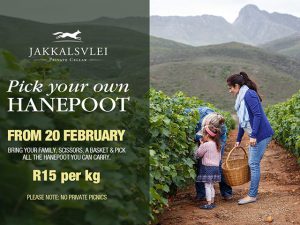 It is time for the annual Jakkalsvlei Hanepoot Picking. “Pick your own Hanepoot” will start on Saturday 20 February 2021. Hanepoot picking times are daily between 10am – 4pm (subject to availability) at R15/kg